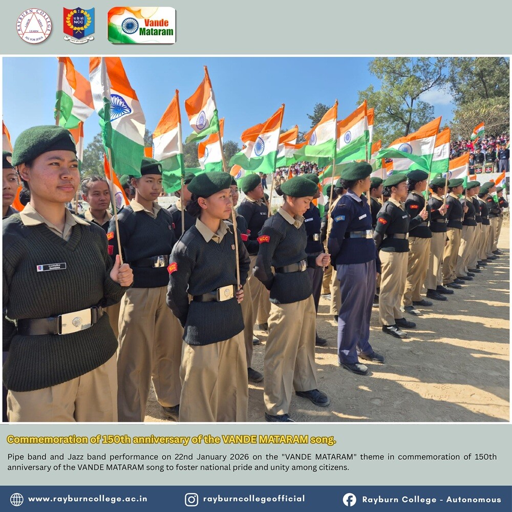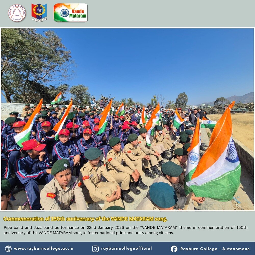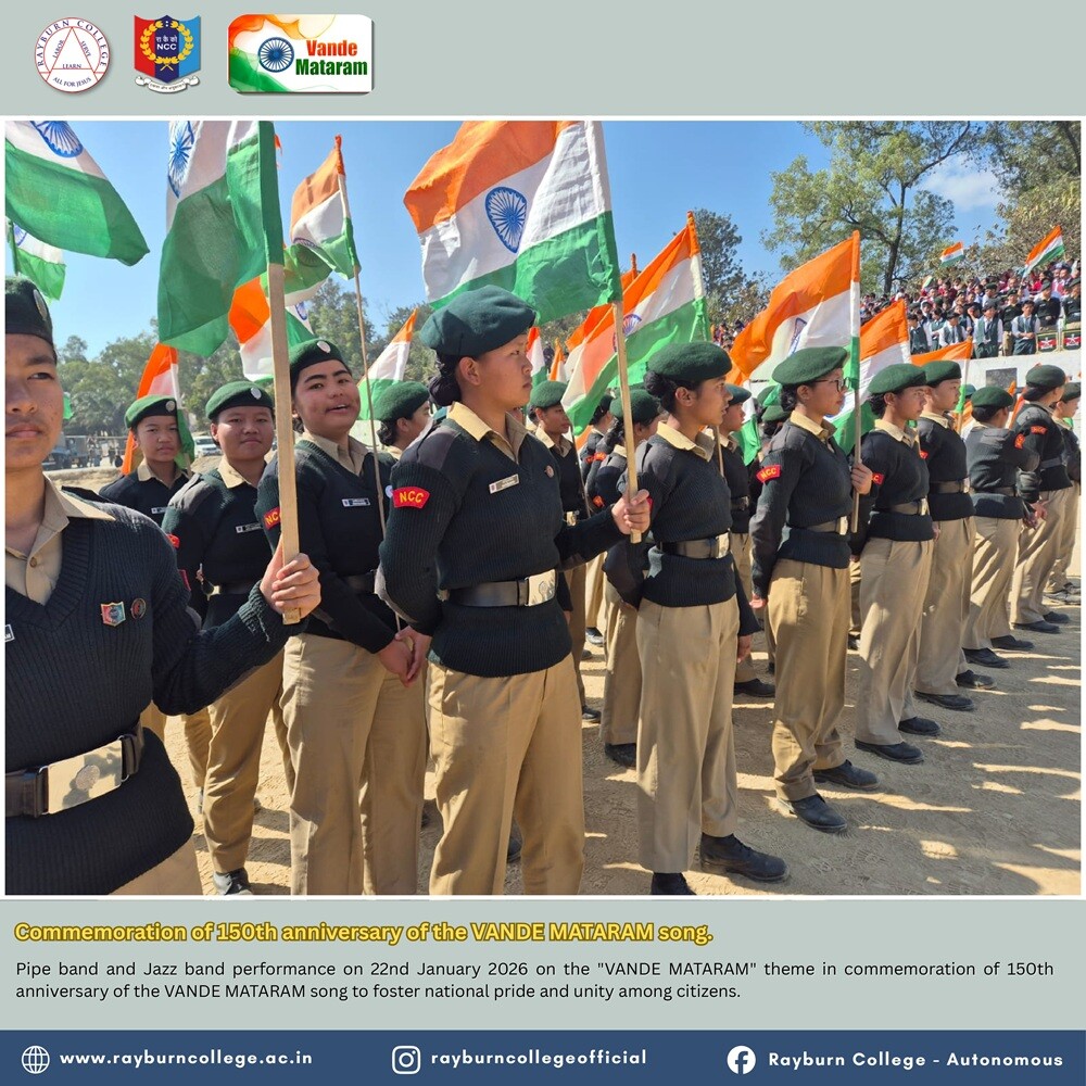 Rayburn College NCC (Army and Air Force Wings) actively participated in the Pipe Band and Jazz Band performance organised at Peace Ground, Churachandpur, on 22 January 2026 at 10:00 hours. The programme was conducted on the theme “Vande Mataram” to commemorate the 150th anniversary of the national song “Vande Mataram,” with the objective of fostering national pride, patriotism, and unity among citizens.