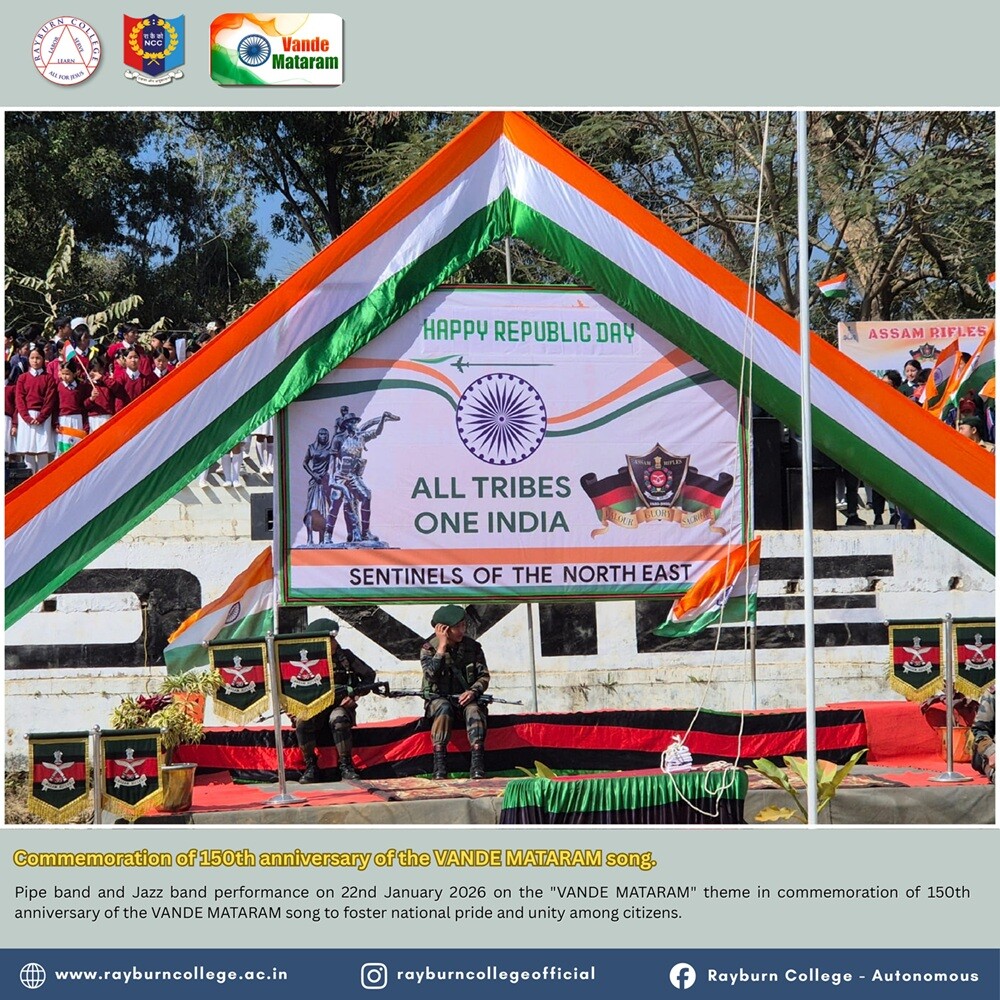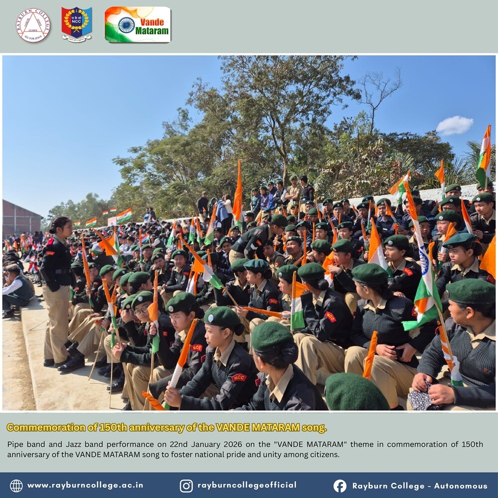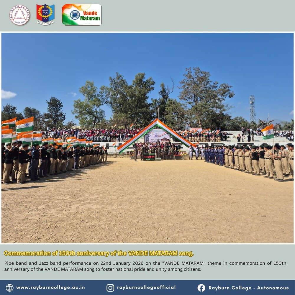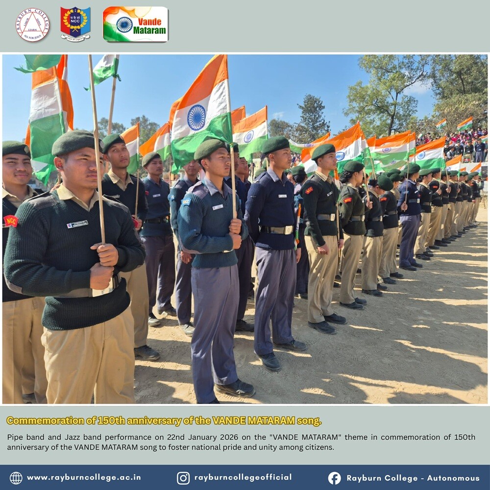 Rayburn College NCC (Army and Air Force Wings) actively participated in the Pipe Band and Jazz Band performance organised at Peace Ground, Churachandpur, on 22 January 2026 at 10:00 hours. The programme was conducted on the theme “Vande Mataram” to commemorate the 150th anniversary of the national song “Vande Mataram,” with the objective of fostering national pride, patriotism, and unity among citizens.
