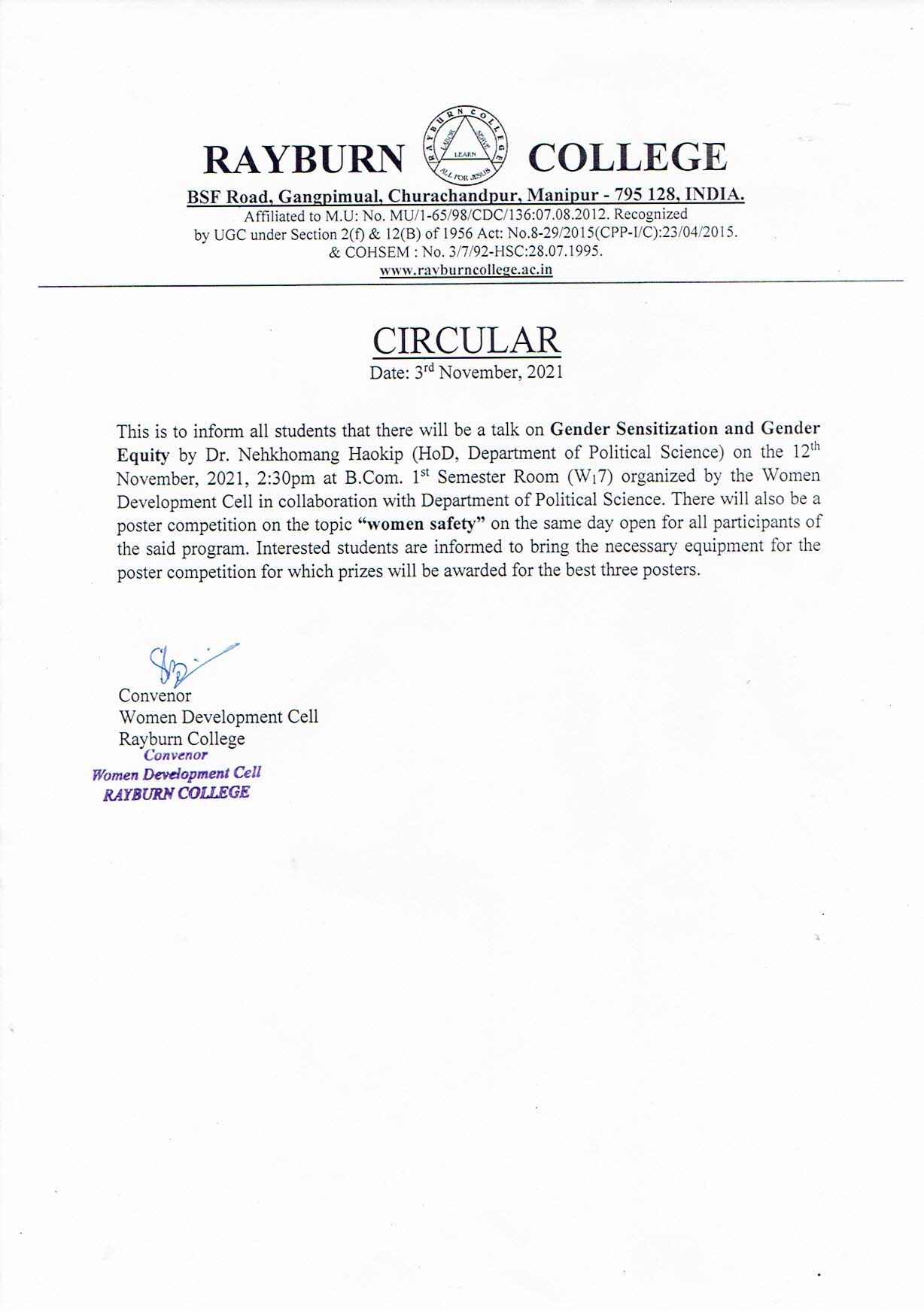 A talk on Gender Sensitization and Gender Equity by Dr. Nehkhomang Haokip, HoD, Department of Political Science on the 12th November, 2021, 2:30 P.M. at B.Com. 1st Semester Room (W17) organised by the Women Development cell in collaboration with Department of Political Science.