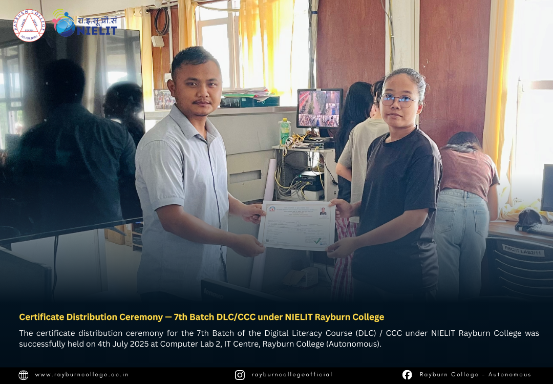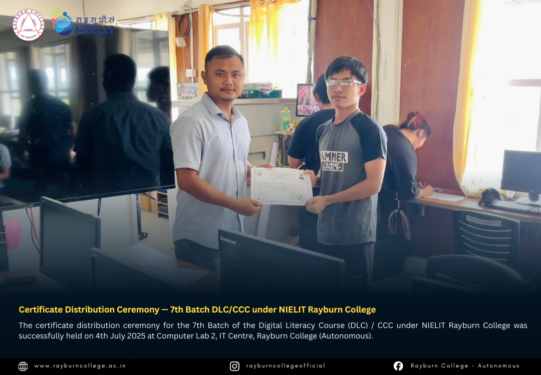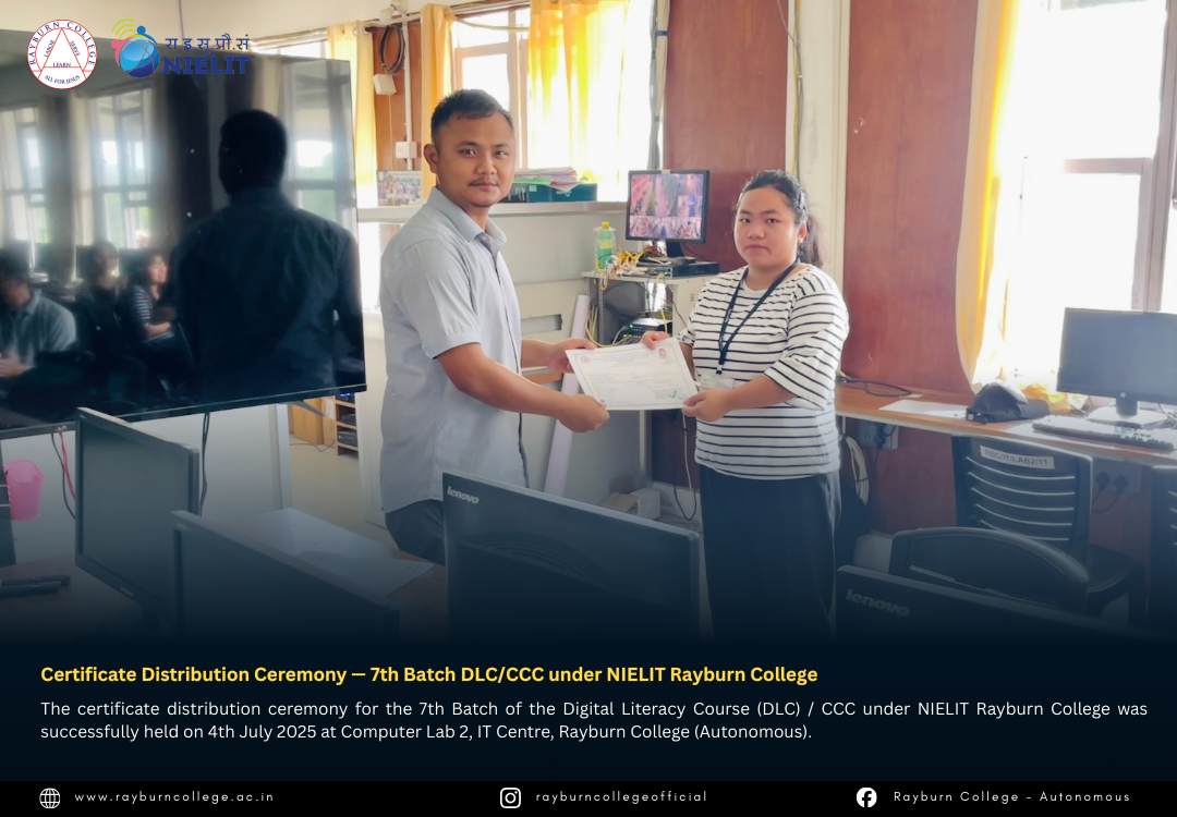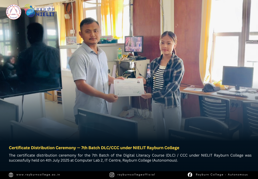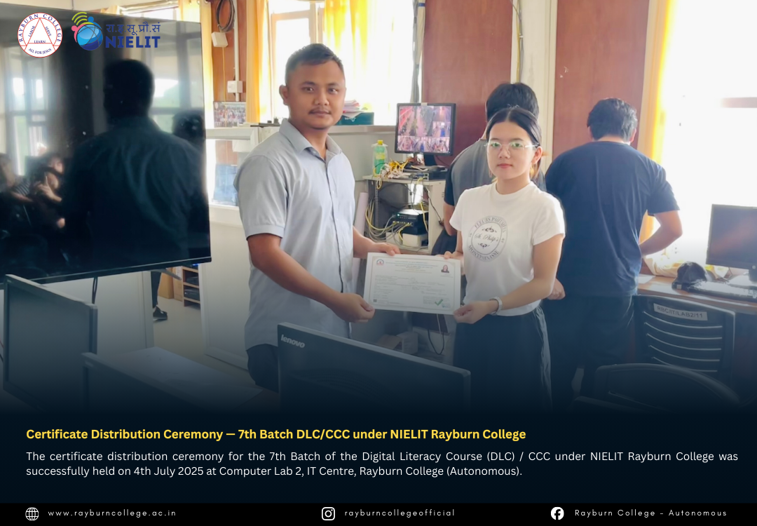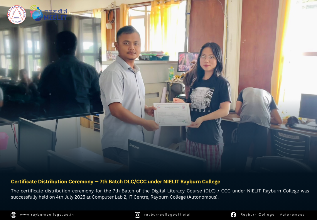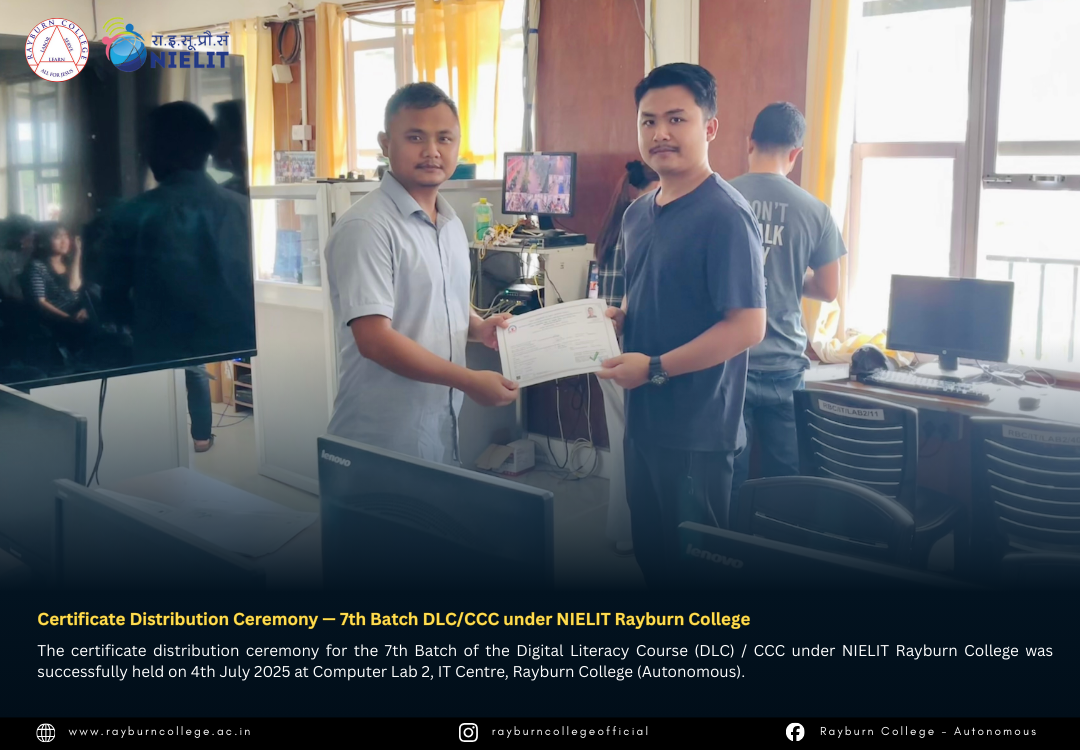 The certificate distribution ceremony for the 7th Batch of the Digital Literacy Course (DLC) / CCC under NIELIT Rayburn College was successfully held on 4th July 2025 at Computer Lab 2, IT Centre, Rayburn College (Autonomous). The event marked another milestone in promoting digital literacy and equipping learners with essential computing skills.