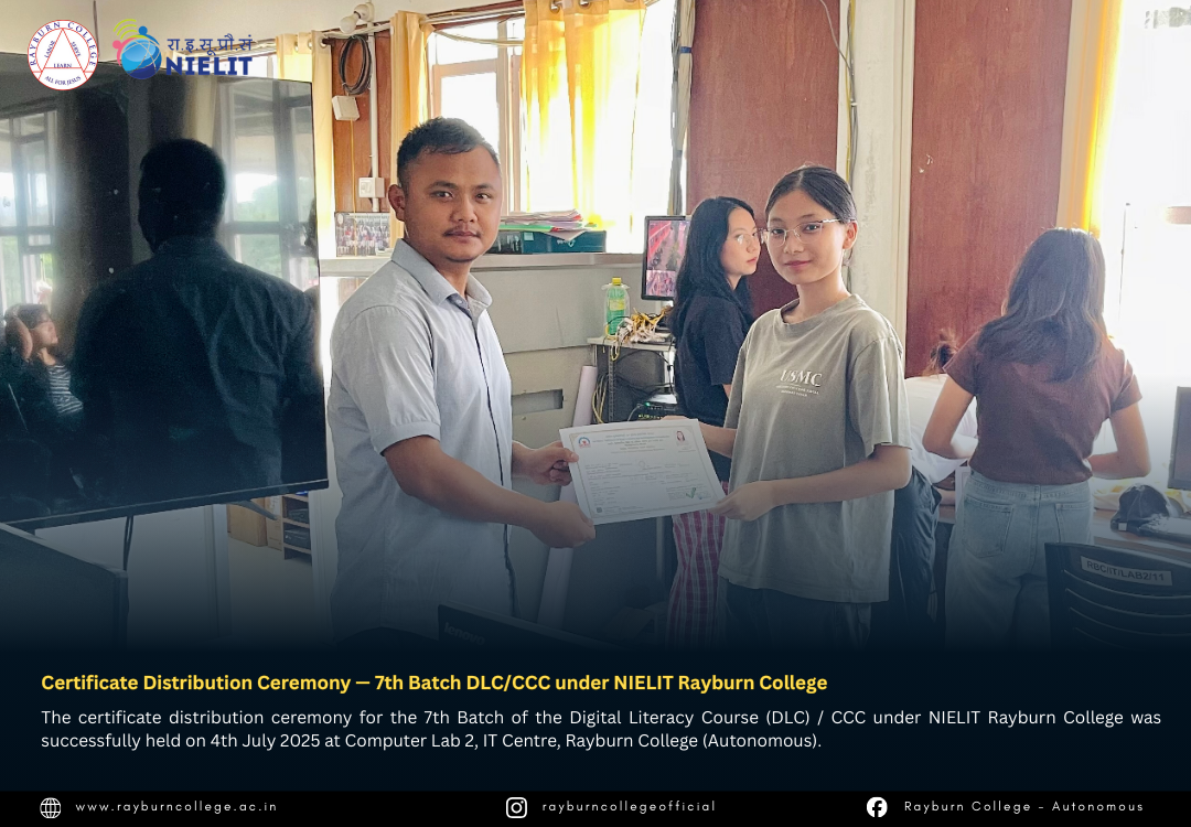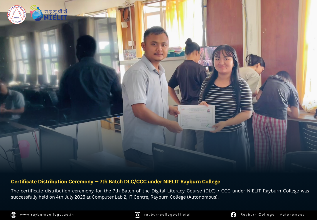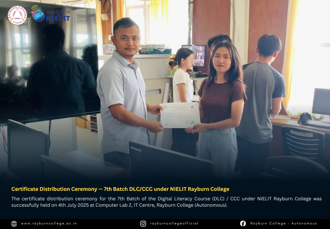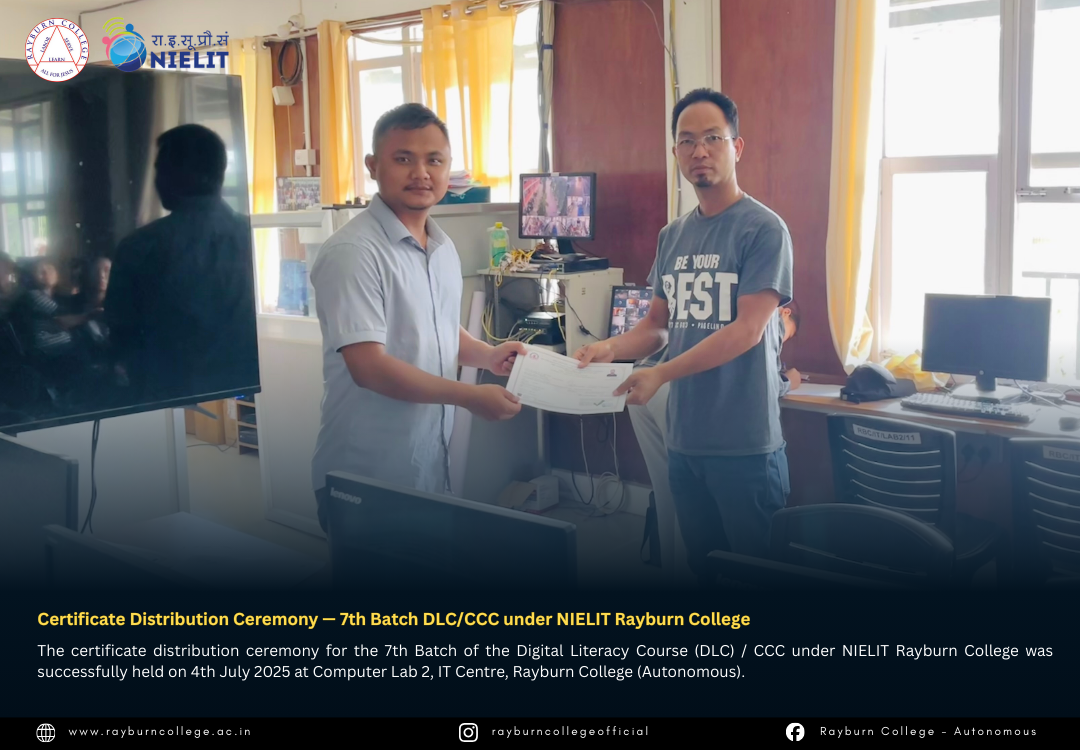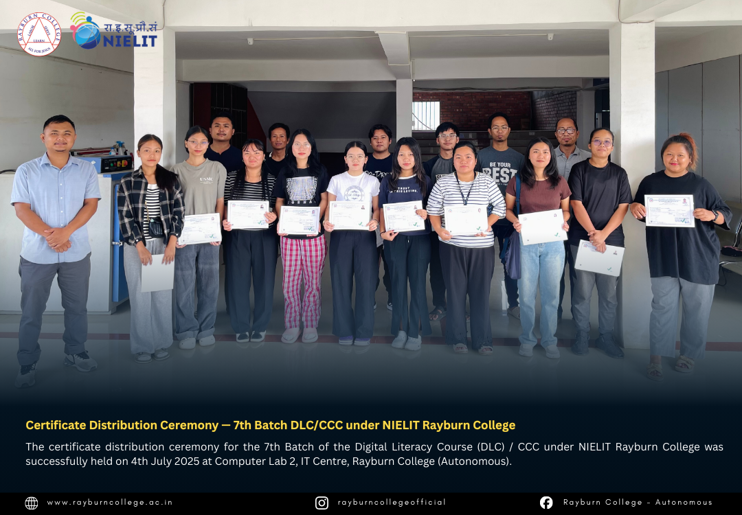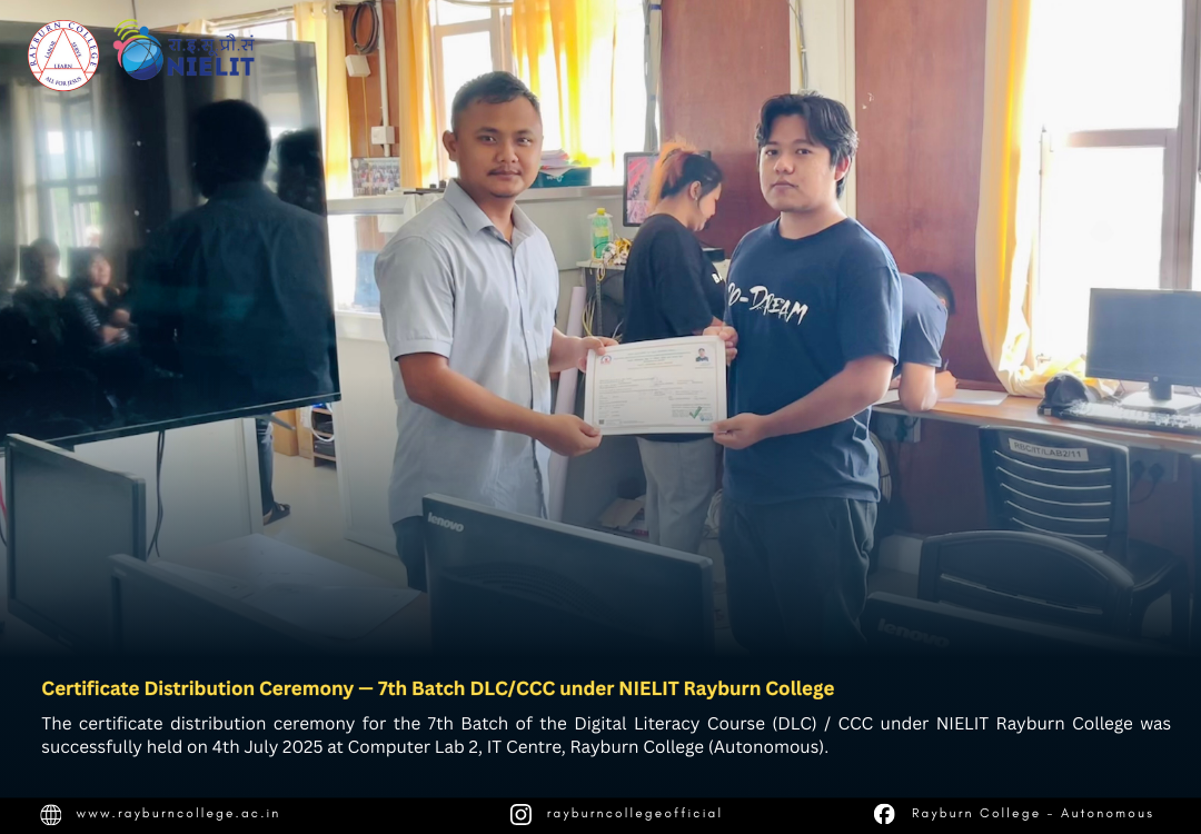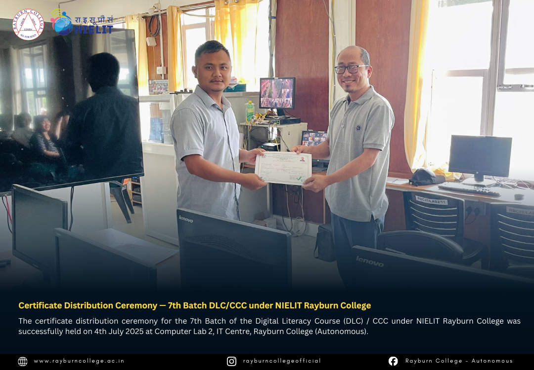 The certificate distribution ceremony for the 7th Batch of the Digital Literacy Course (DLC) / CCC under NIELIT Rayburn College was successfully held on 4th July 2025 at Computer Lab 2, IT Centre, Rayburn College (Autonomous). The event marked another milestone in promoting digital literacy and equipping learners with essential computing skills.