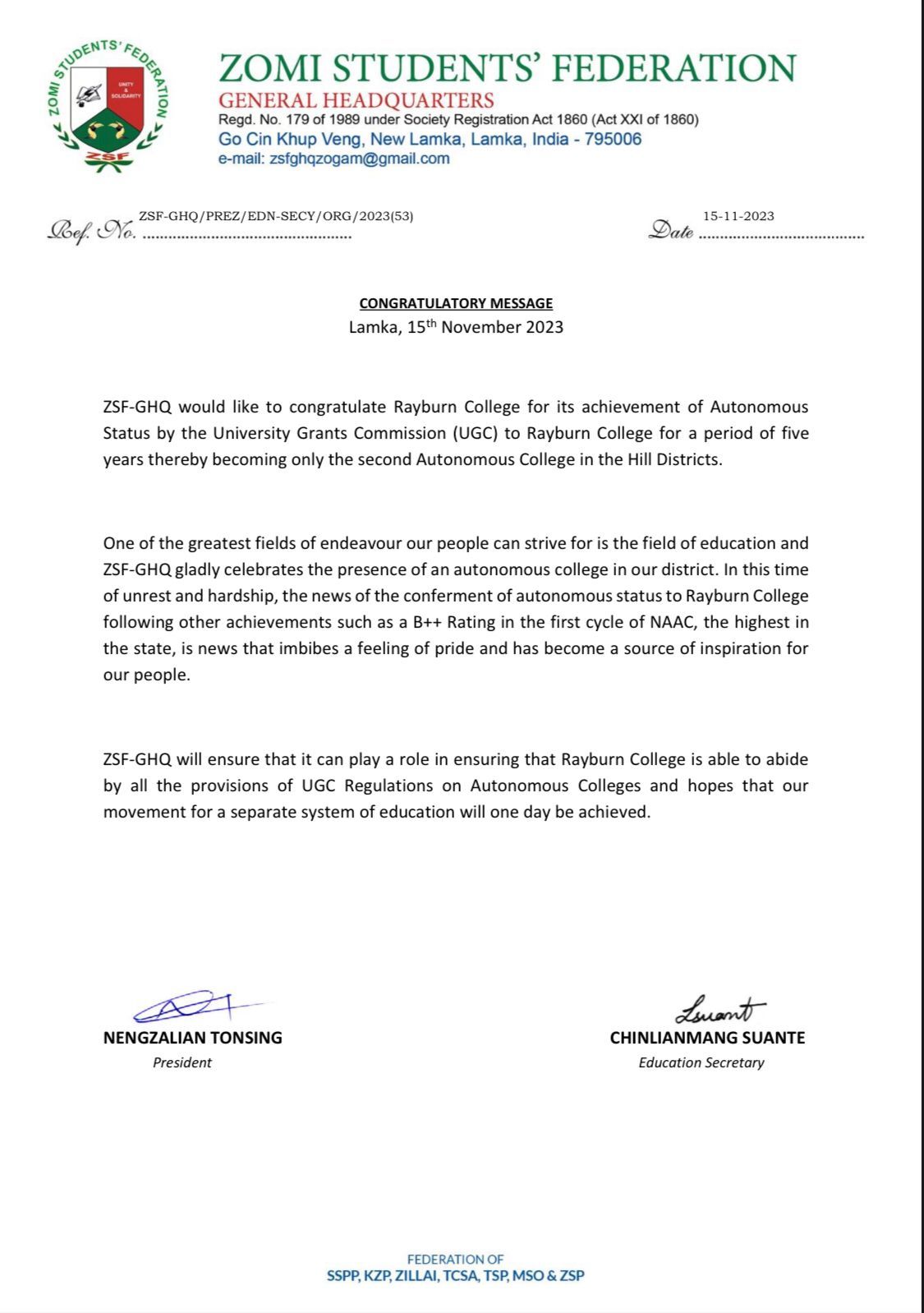 Rayburn College, BSF Road, Gangpimual, Churachandpur, Manipur-795006 affiliated to Manipur University, Imphal has been conferred Autonomous Status for a period of 05 years from the academic year 2024-2025 to 2028-2029 as per clause 7 .4 of the UGC (Conferment of Autonomous Status Upon Colleges and Measures for Maintenance of Standards in Autonomous Colleges) Regulations, 2023.