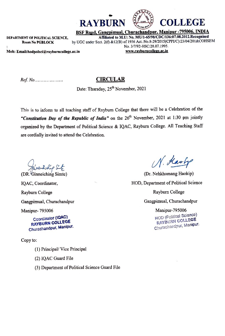 This is to inform to all teaching staff of Rayburn College that there will be a Celebration of the "Constitution Day of the Republic of India" on the 26th November, 2021 at 1:30 p.m. jointly organized by the Department of Political Science & IQAC, Rayburn College. All Teaching Staff are cordially invited to attend the Celebration.