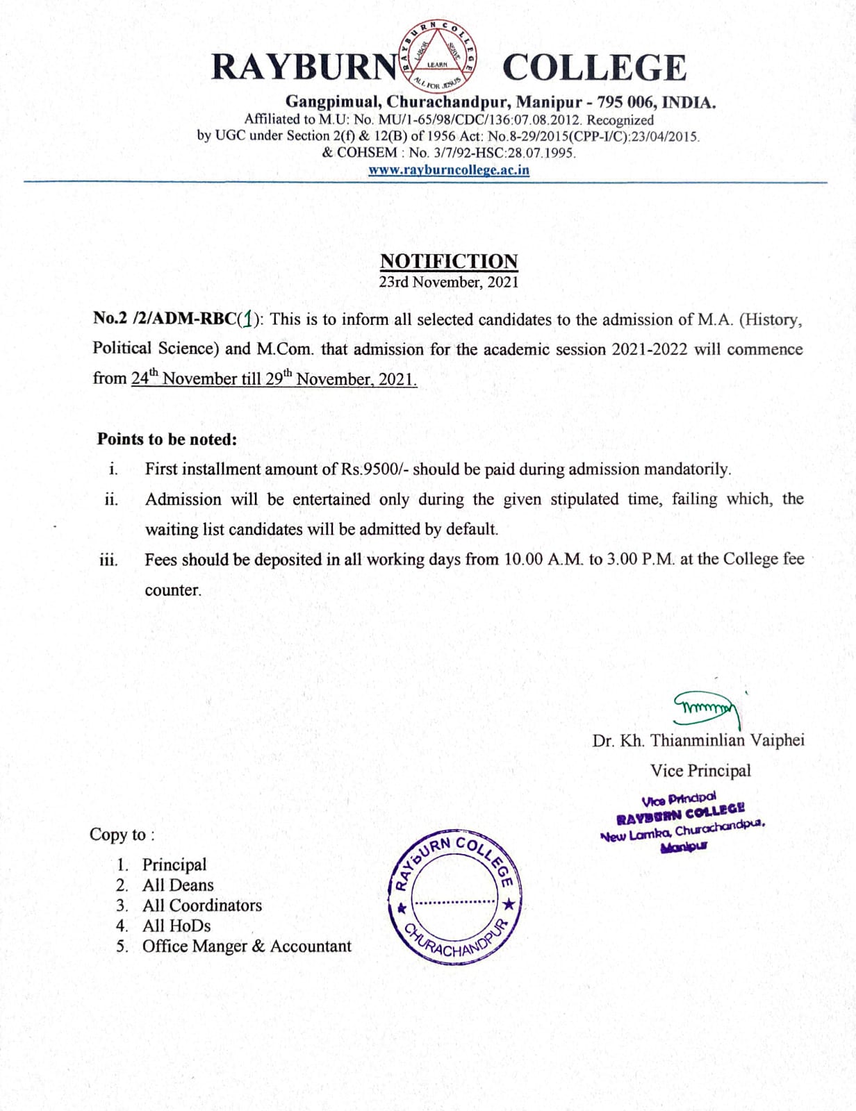 This is to inform all selected candidates to the admission of M.A. (History, Political Science) and M.Com, that admission for the academic session 2021 - 2022 will commence from 24th November till 29th November, 2021