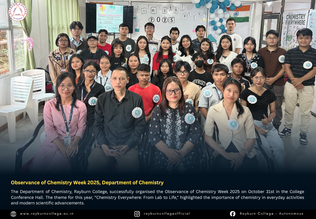 The Department of Chemistry, Rayburn College, successfully organised the Observance of Chemistry Week 2025 on October 31st at 2:00 PM in the College Conference Hall. The theme for this year, “Chemistry Everywhere: From Lab to Life,” highlighted the importance of chemistry in everyday activities and modern scientific advancements.