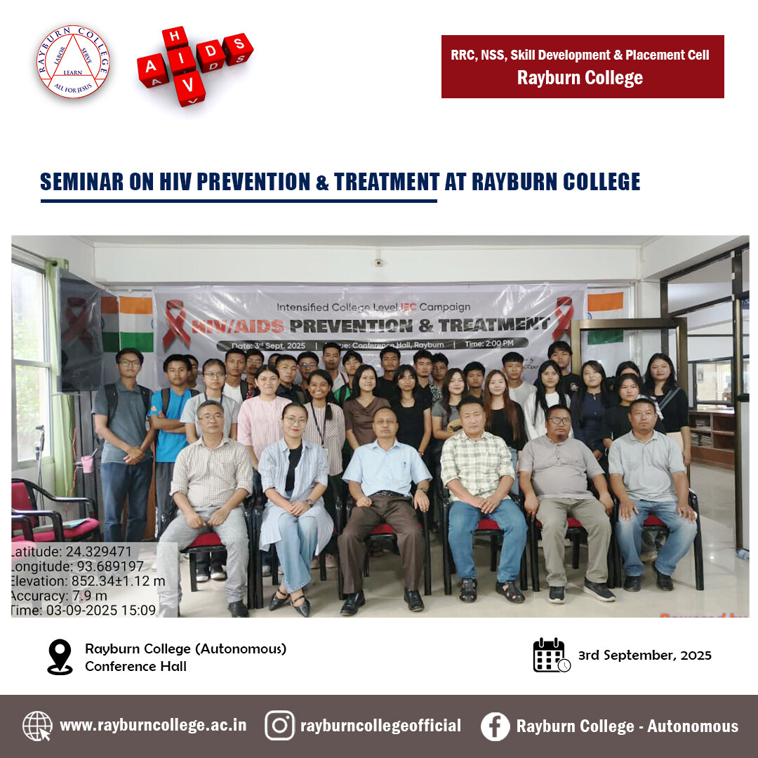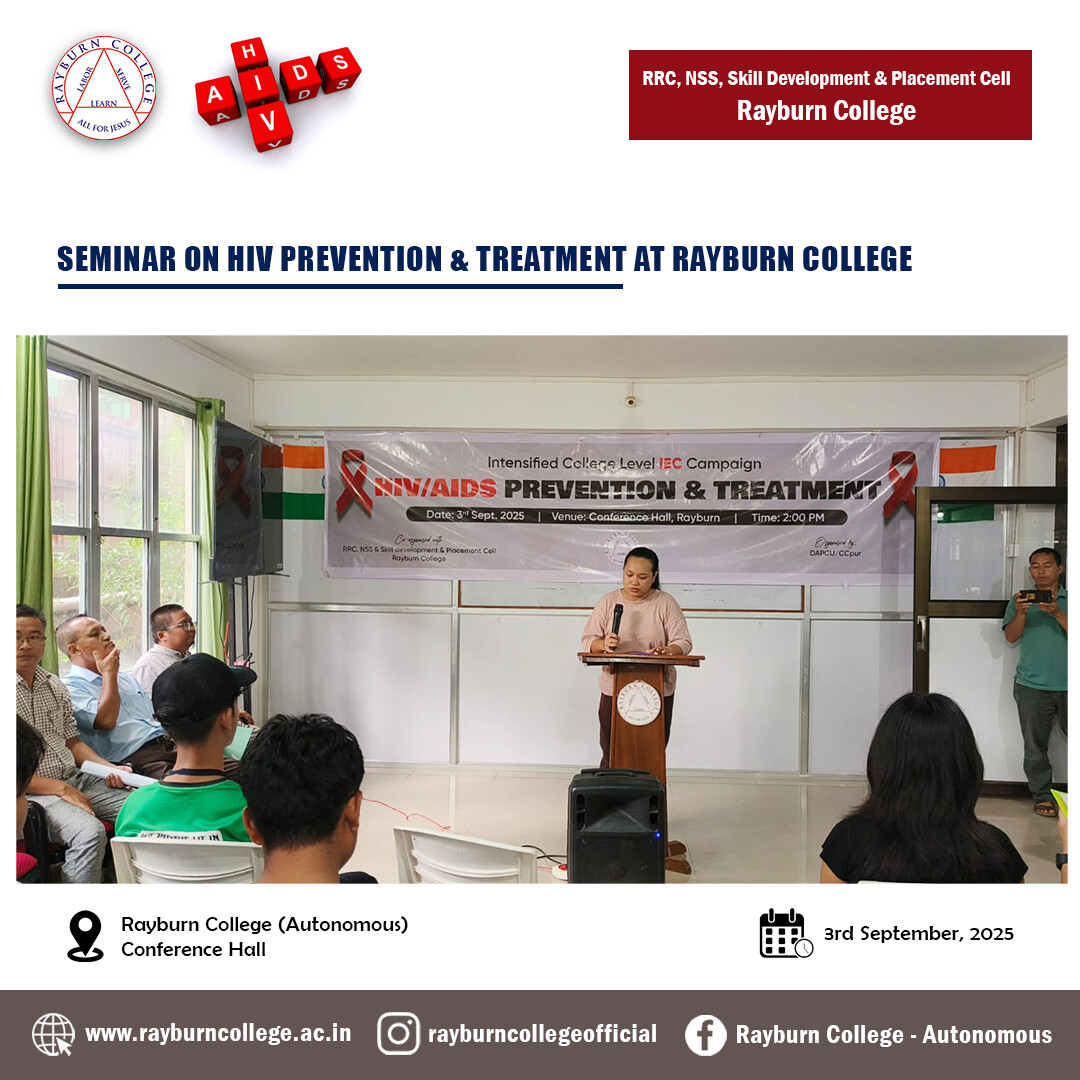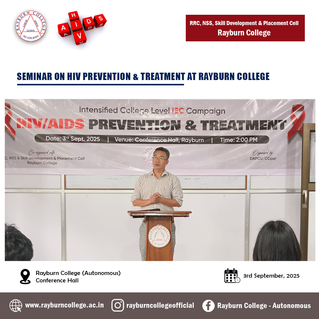 Rayburn College NSS and Skill Development Cell, in collaboration with the District Hospital, organized an informative seminar on “HIV Prevention & Treatment” on 3rd September 2025. The Resource Person for the programme is Mr T. Benjamin, Supervisor, DAPCU. The program aimed to raise awareness about the HIV/AIDS epidemic, address misconceptions, and promote proactive strategies for prevention and treatment.