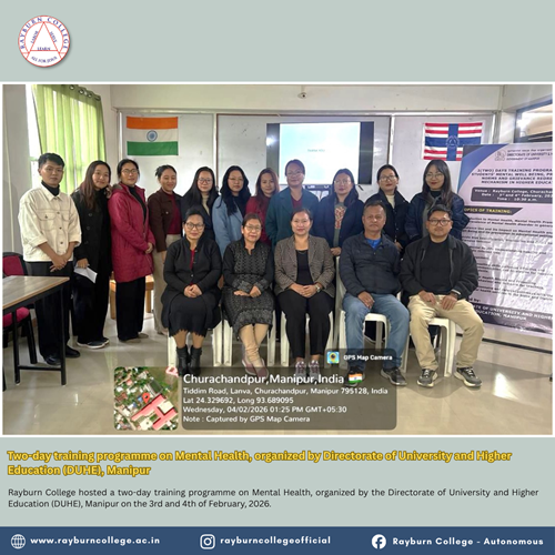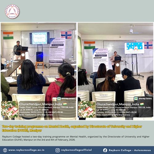 Rayburn College hosted a two-day training programme on Mental Health, organized by the Directorate of University and Higher Education (DUHE), Manipur on the 3rd and 4th of February, 2026. The programme was conducted with the objective of strengthening mental health awareness, early identification, and support mechanisms within higher education institutions.